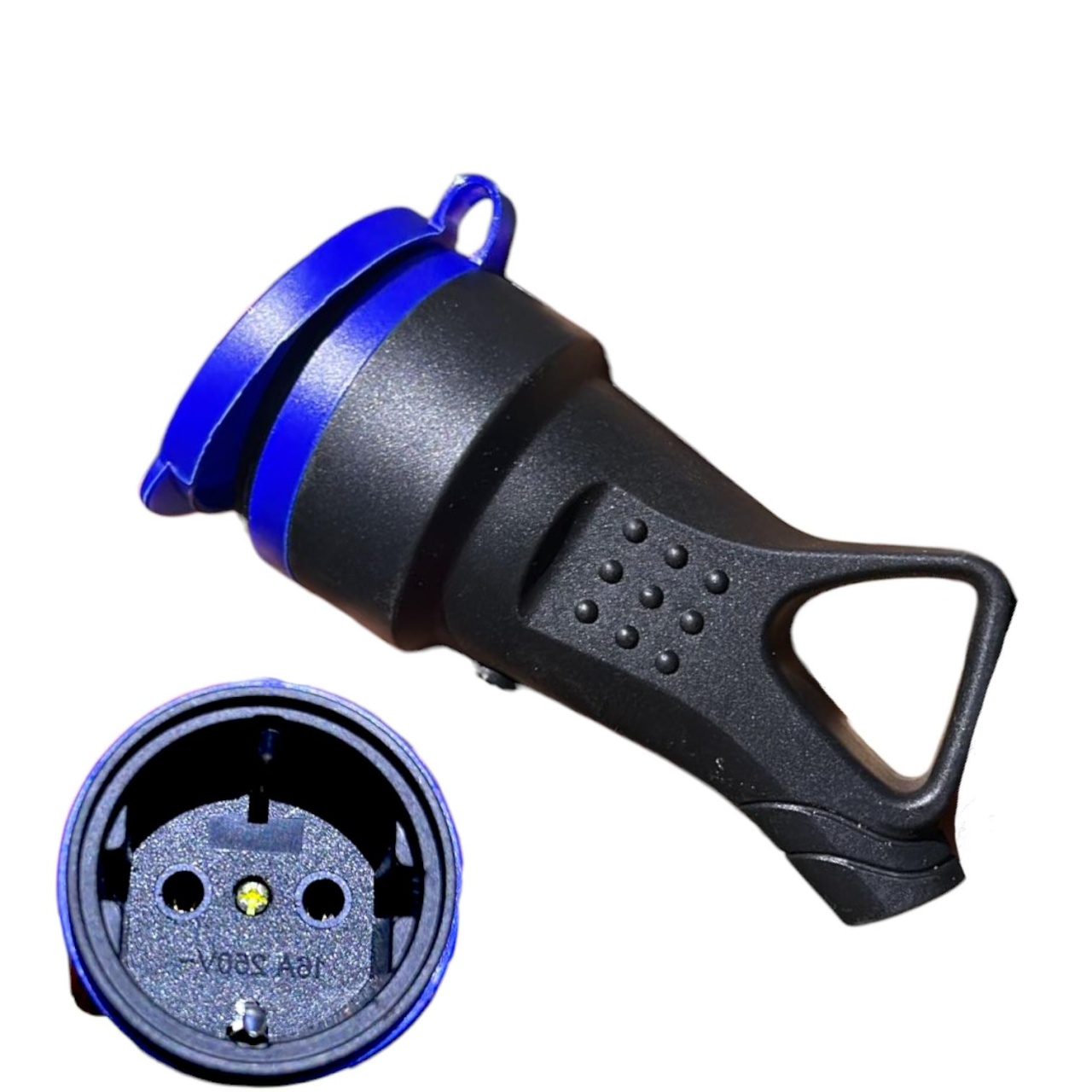 Европейская водонепроницаемая контактная электрическая розетка или съемный каучуковый адаптер для вилки от "MAXIMUM QUALITY TOOLS" с защитной крышкой применяется для установки на шнурах электроприборов, электроинструментов, электрических удлинителях в сложных условиях эксплуатации, т. е. там, где обычная пластиковая вилка может быть повреждена или раздавлена. Такие розетки используют для комплектации на строительных объектах, в цехах предприятий, гаражах и на дачных участках. Розетка каучуковая16 А с защитной крышкой применяется для установки на шнурах электроприборов, электроинструментов, электрических удлинителях.