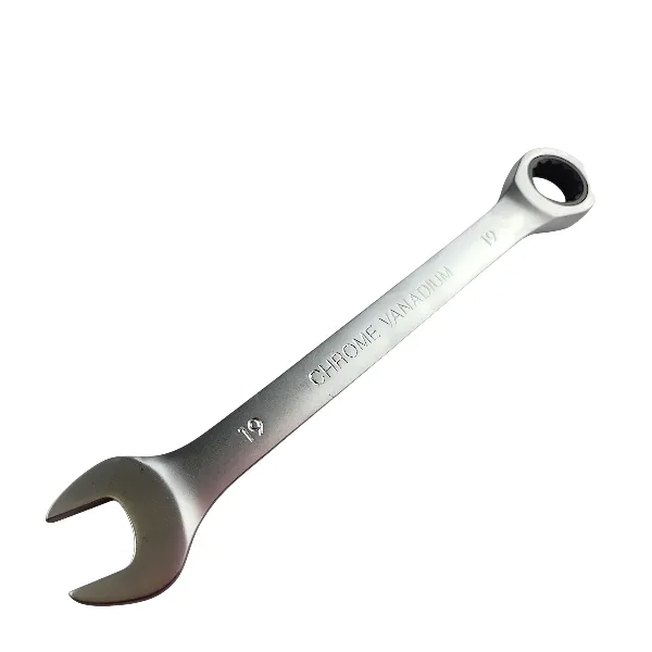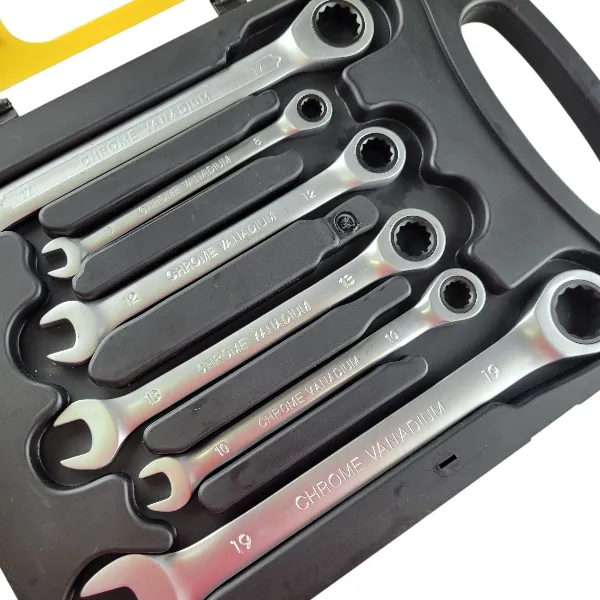 В набор рожково-накидных ключей с трещоткой входит 7 инструментов из высокопрочной хромованадиевой стали. В кольцевой профиль ключа установлен специальный храповый механизм (трещотка). Минимальный угол поворота 5°. Cталь CrV с финишной матовой отделкой хромоникелевым покрытием предотвращает выскальзывание инструментов из рук и исключает бликовое ослепление. Набор поставляется в специальном пластиковом боксе со сглаженными углами.