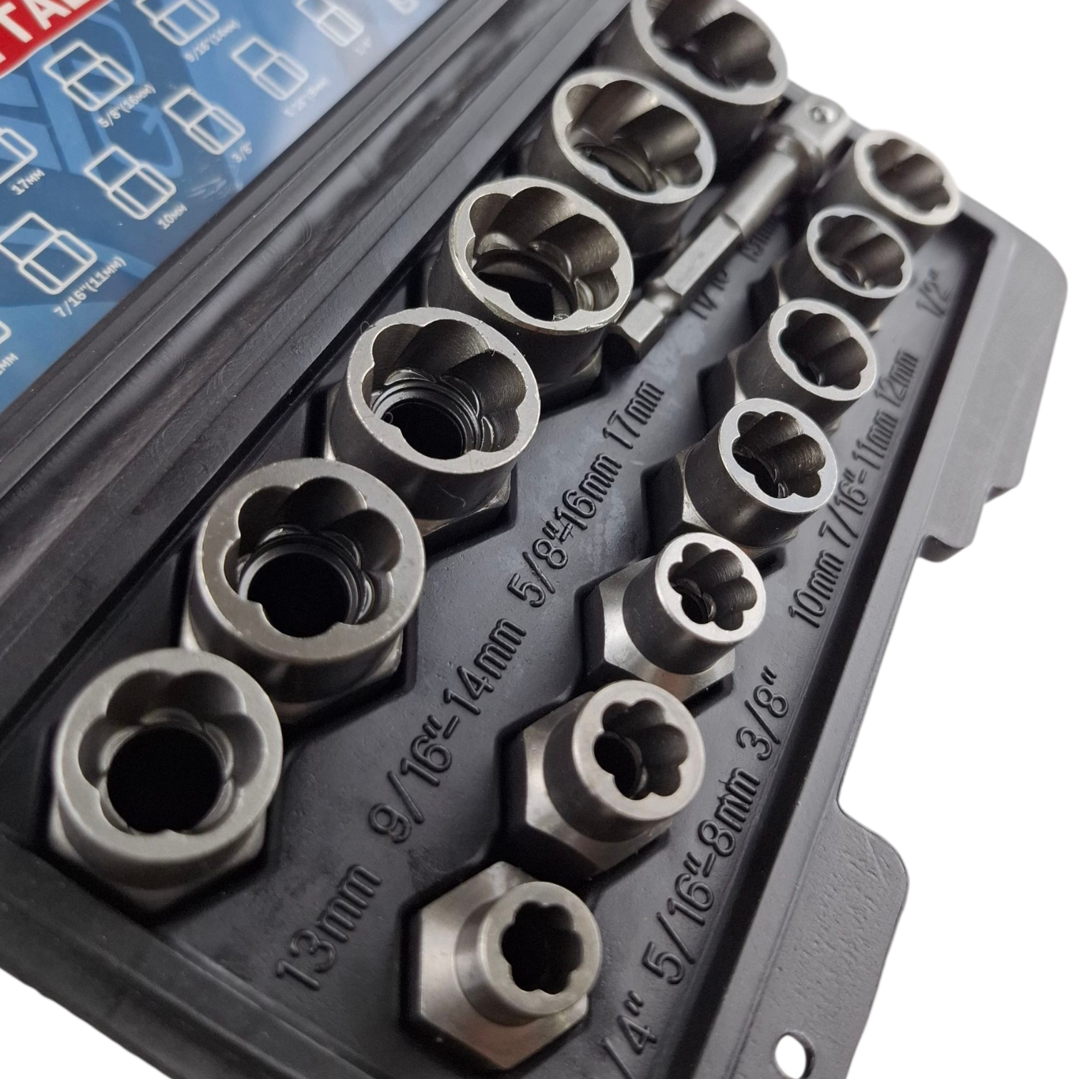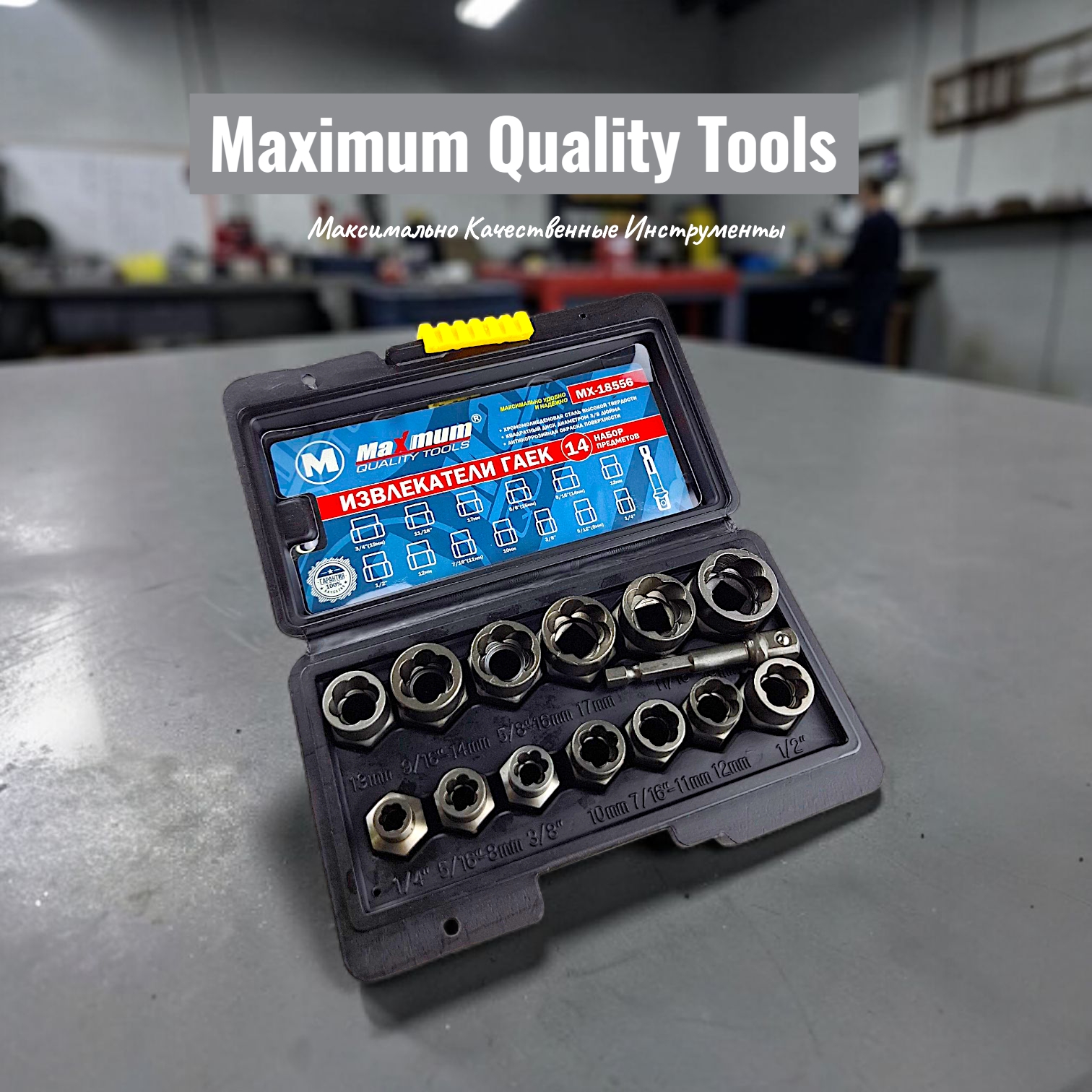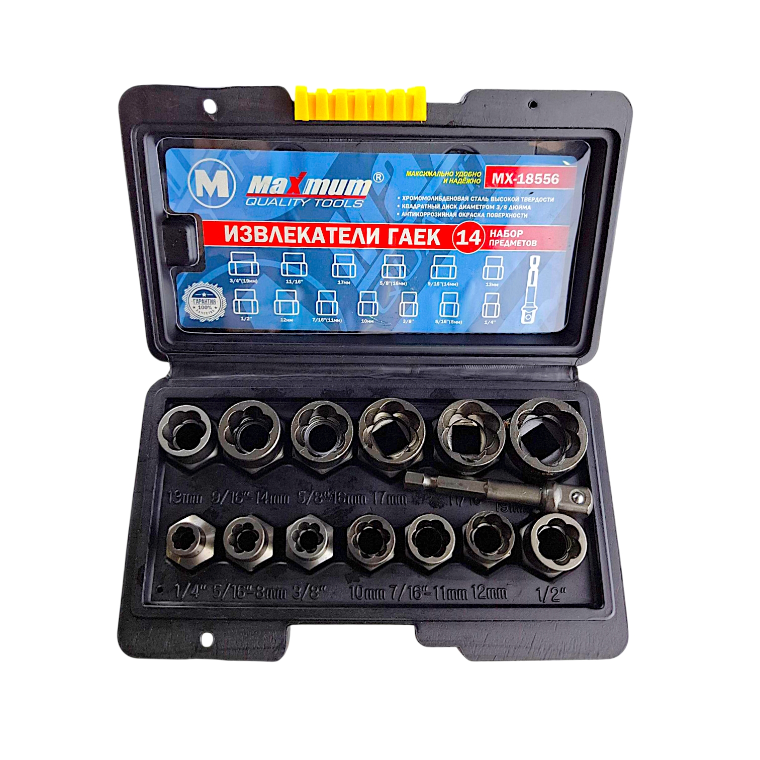 Профессиональный набор для удаления сорванных (прикипевших или закругленных) гаек и болтов от "Maximum" состоит из 13 торцевых головок и переходника 1/4.